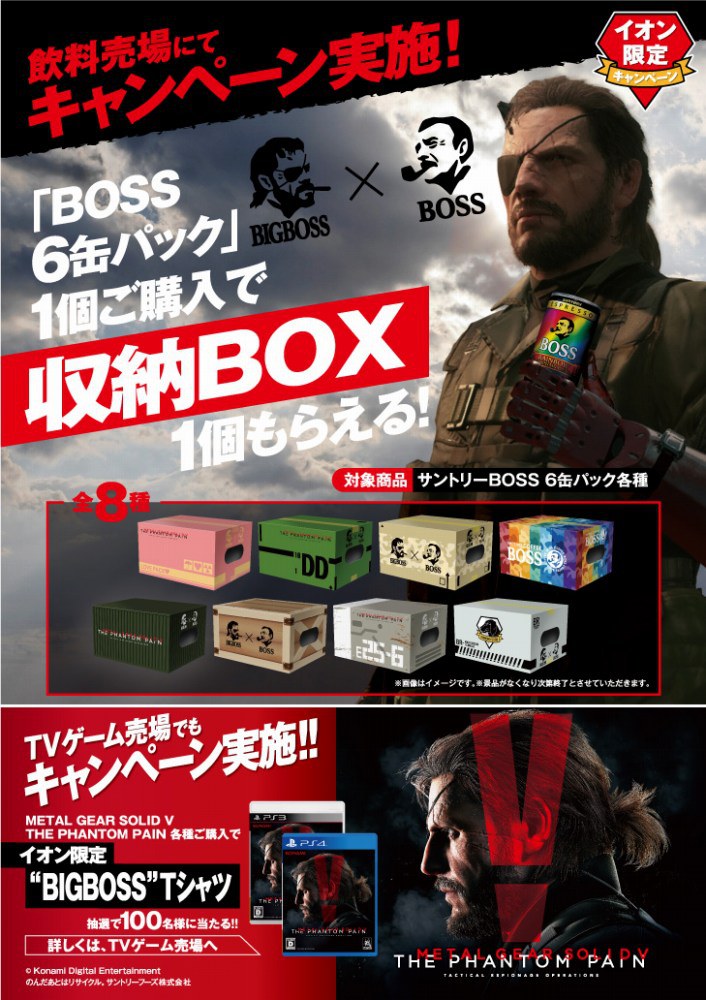 キャンペーン期間中に全国の総合スーパー「イオン」(沖縄を除く)で、サントリー BOSS 6缶パック各種を購入すると、『MGS V: TPP』仕様の収納BOX(8種)がもれなくプレゼントされます。さらに、イオンのゲーム売り場で『METAL GEAR SOLID V: THE PHANTOM PAIN』を購入すると抽選100名に限定Tシャツが貰えるキャンペーンも行っています。