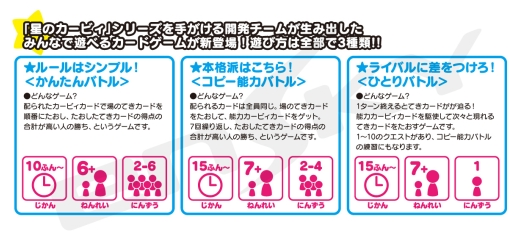 「星之卡比 卡比的複製爭奪戰!」是以遊戲《星之卡比》系列為題材的卡片遊戲。本商品是由系列作的開發團隊負責製作,卡片插圖也全部都是全新繪製。