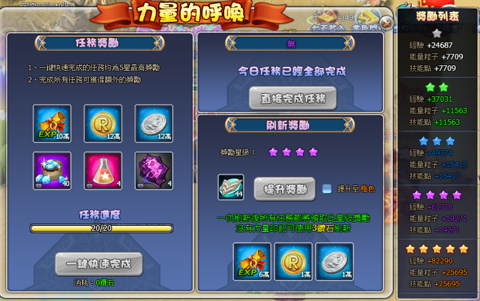 力量試煉相當於各遊戲中的每日任務,一天20個是必完成項目
