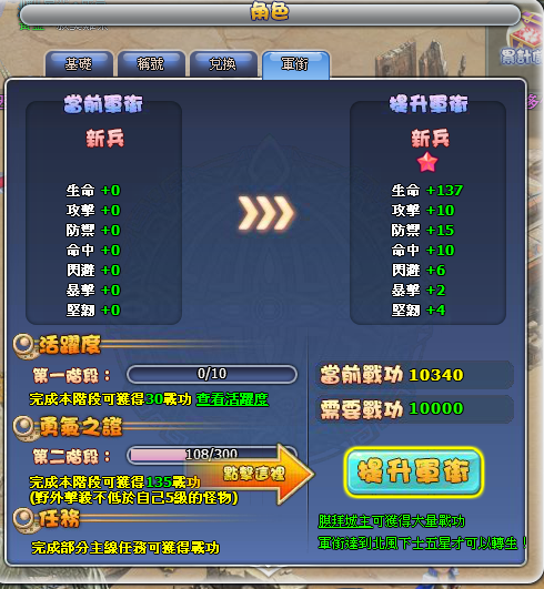 玩家可以透過主線任務、打怪、活躍度累積、膜拜城主等方式取得戰功,藉此提升角色的軍銜,提升軍銜也會增加角色的能力,也是之後轉生的必要條件喔。