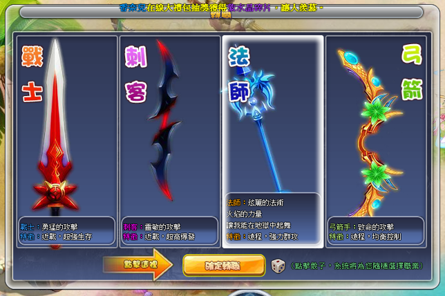 在遊戲初期,只要乖乖的跟著任務跑(要注意當人物閒置一段時間系統會自動慢慢的幫玩家跑任務,不過重大選擇的時候會停住),等級就會慢慢升上去,很快的就到了選擇職業的時候了,這邊大家可以看一下職業下面的介紹,選擇自己喜歡的職業,這邊我選的是法師,那個強力群攻看得好誘人。