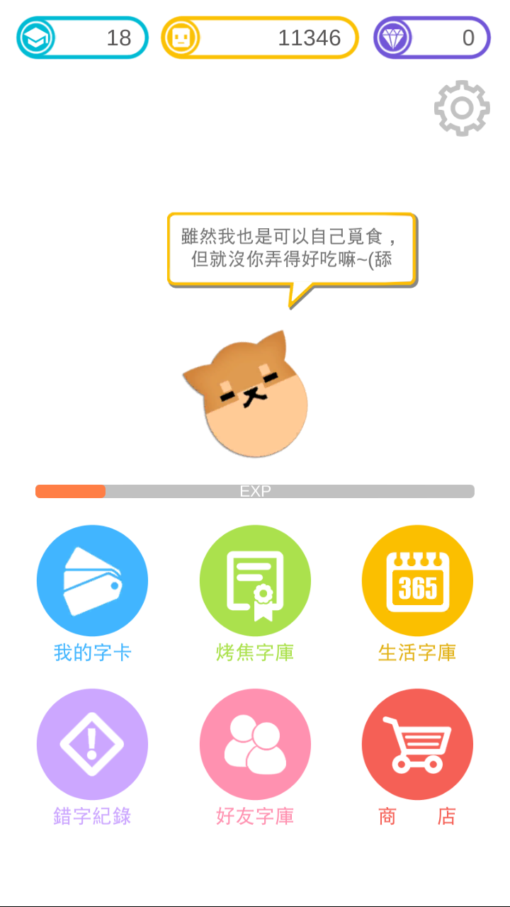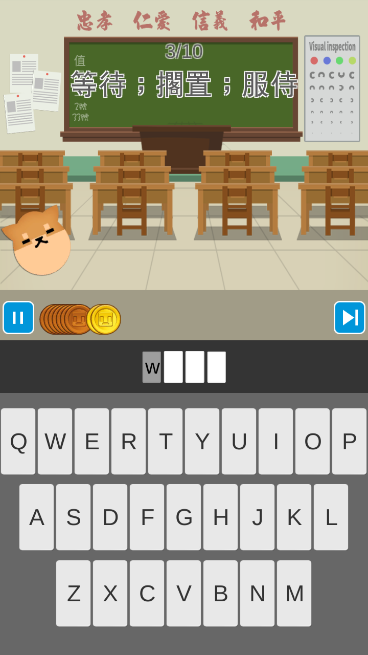 )字庫以後,就可以選擇關卡,關卡中會給予中文的題目,而玩家必須要正確地回答出對應中文的英文單字,每打對一個英文字母就會給予一定的金幣,回答全對則會多給予一些金幣,如果當寵物從左邊走到右邊,還沒回答出來,則算是錯誤