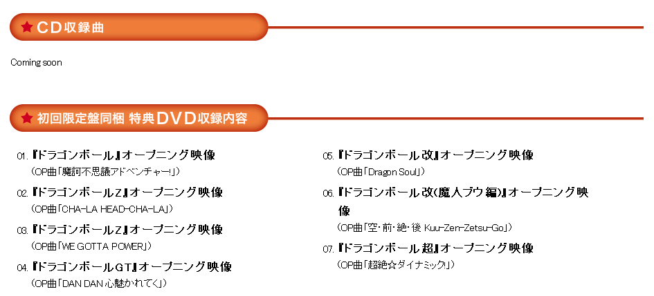 初回限定盤附特典DVD將收錄1988年七龍珠劇場版《摩訶不思議大冒險》主題曲、七龍珠Z主題曲、七龍珠GT主題曲、七龍珠改主題曲、七龍珠改魔人普烏篇主題曲以及七龍珠超主題曲映像。CD所收錄的詳細歌曲將於日後發表。通常盤售價2,778日幣(未含稅)、初回限定盤附特典DVD售價3,500日幣(未含稅)。