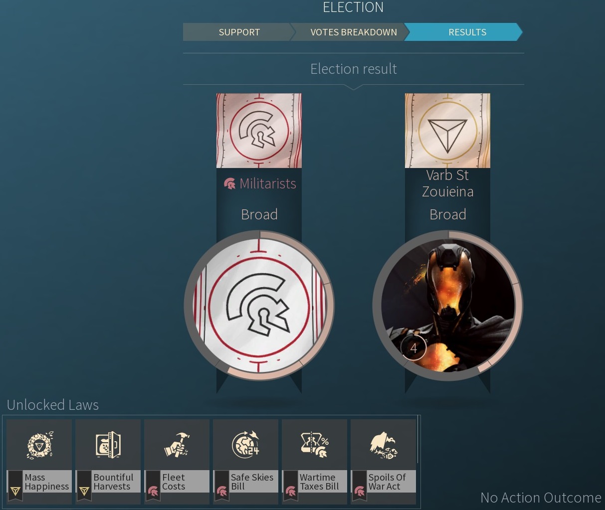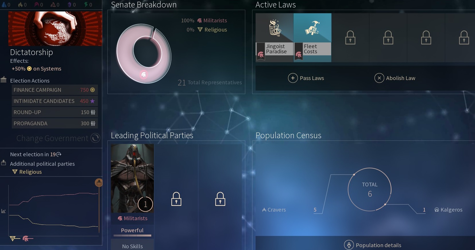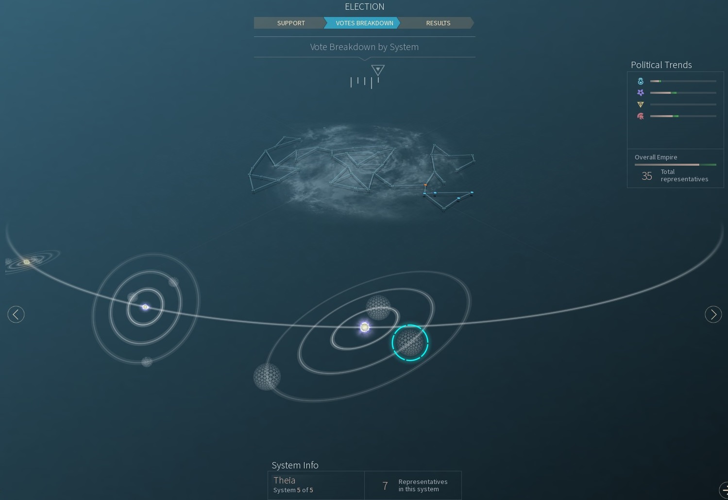 目前選舉大概20回合(普通速度)選一次,會有剪報圖顯示各星球上的票數