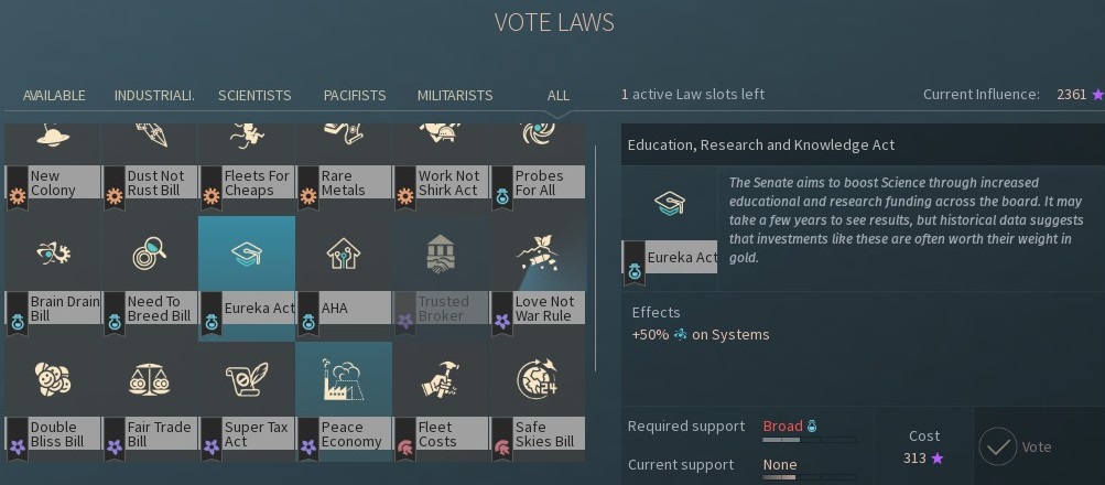 ↓如下圖,此法律可以+50%科技產量;但需要 1/2的黨派支持度