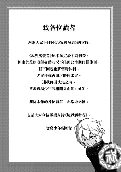 由葦原大介老師繪自從2013年第11號開始連載於《週刊少年JUMP》的人氣作品《境界觸發者》,於最新一期的第52號寶島和JUMP上宣布因作者身體不佳而將長期停止連載休刊。