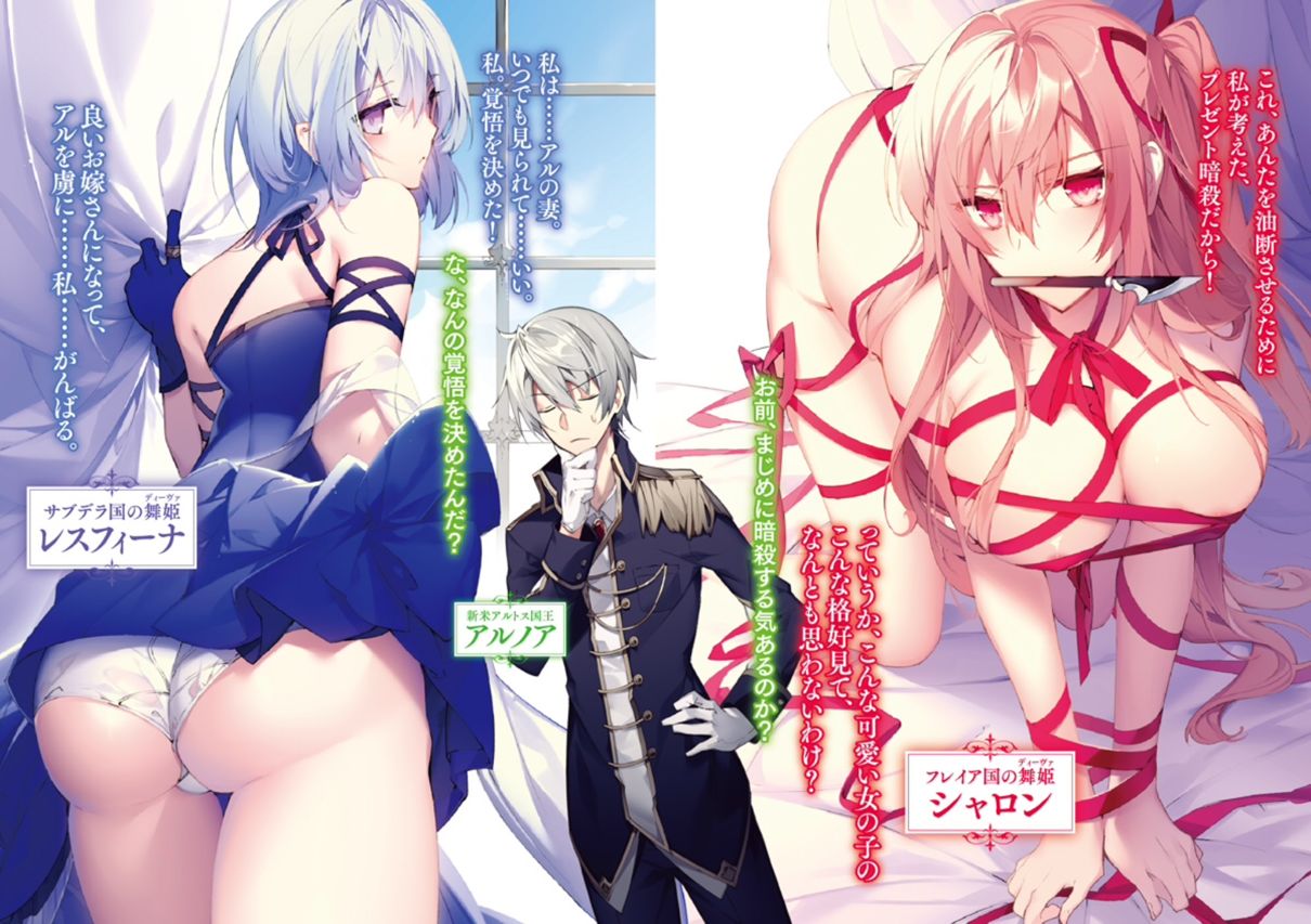 第一卷有點厚,接近四百頁,書套差點包不下,不過內容倒是沒有很複雜,閱讀進度比我想像中還要快上不少,本作的感想簡單來說呢……加入各種既視感的賣肉向後宮劇吧?雖說還不至於讓我吐滿口血,但感覺也接近了,本作是第2回OVERLAP大賞的銀賞作品……嘛,就是這樣。 故事背景設定在一個群雄割據的時代,我們的男主角年紀輕輕繼承亞爾托斯國的王位,成為一國之君。然而,亞爾托斯因為出現內鬨分歧,導致他成為國王後,國力大不如前,變成周邊國家眼中的待宰肥羊,幾次派兵侵略,但不知怎的……我真的很想知道男主角是如何擊退侵略的敵人……總而言之,在作者不知讀者也不知的情況下,周邊國家發現派兵侵略沒有太多利益可圖,因此異想天開……只要把我家美若天仙的舞姬公主們派出來當男主角的老婆不就解決了,可以不花任何力氣,併吞亞爾托斯,可喜可賀。 剩下如故事簡介所述,在陰錯陽差之下,兩名舞姬同時來到男主角身邊,再加上本國的舞姬,總共有三名舞姬……啊,為什麼我會想到某個延長線之王。第一卷從開頭到結尾都在調情開後宮,各種爭寵、倒貼和色誘,傲嬌屬性的夏蓉、想搓成既成事實的菲娜,以及為了變成弟弟妻子展現出驚人行動力的情色義姊瑟希莉亞……不只這些,還有總是色誘主子的女僕長和三句不離要嫁給男主角當新娘子的諜報隊蘿莉隊長。 本作設定的舞姬……嗯,就是擁有強大力量的少女,不過與隔壁棚的戰姬相比卻沒什麼強大的印象。要展現出她們的價值,那就只有戰場,揮舞足以扭轉戰局的聖遺物武器,殺個敵兵片甲不留。然而,作者的交代方式……日常就是舞姬們動用力量互相爭吵損毀男主角的城堡,等到戰鬥時感覺就只是勇者身邊的魔法師和劍士這類的角色,完全感受不出她們強大的一面。 除此之外,本作的男主角還自帶讓女性高潮的機能。由於是魔王的容器,與舞姬有許多淵源,兩者接觸之後會引發一種稱作「判神行為」的現象。換句話說,會讓舞姬們不要不要的,同時還能輸送魔力給她們增強力量……這和隔壁棚的絕頂改裝真的有87分相似。不過隔壁棚的男主角可是揉了十頁,這裡的男主角只是揉了幾下就讓舞姬們逆天了。 劇情方面,我想這部作品一定會有讀者看到吐血。 首先,男主角的性格。這位男主角身上聚集了優柔寡斷和天真爛好人這兩項堪稱萬惡的設定,想必也是提供各位血液的最重要來源。男主角高喊著「我要解救所有奴隸,創造出一個大家和平共存的世界」的口號,為了實現這個理想,他瘋狂買下所有奴隸,還給他們的自由,甚至還對士兵下令絕對不能殺人。從分類來說,這部作品是戰記,換句話說會有戰爭。既然有戰爭,為了實現自己的夢想,身處弱國地位的國家本沒有兵不血刃這個選項,但作者太過刻意強調男主角的聖人形象,導致劇情變得沒有深度,任何事情都用這是男主角的堅持來帶過,從頭到尾見血的只有男主角,敵人有沒有死過一人都不知道。這已經不叫做戰爭,而是在家中玩樂高呀! 隔壁棚的亞爾斯蘭也懷有想要解放奴隸的夢想,認為沒有奴隸的世界才是讓國家走向正軌的正確道路,雖說一開始同樣懷有天真的想法,但經過軍師的調教好歹認清自己必須要有力量才能辦到,不然一切都是空談和害人。然後,本作的男主角也遇到一模一樣的情境,盲目認為奴隸自由後會獲得幸福,而他身邊有一個堪稱朋友的基友。基友早就知道男主角沒有力量,這些話都只是空談,為了讓他知道這點,只好——扮演刺客來殺死他。 ……什麼? 說實話,看到這段我一度闔起書本,已經完全不明白作者到底想幹什麼。這大概是我看過這麼多作品以來,最蠢也最讓人傻眼的做法。一般而言,要讓一個溫室中的花朵體認到現實,那就是將真正的現實呈現出來,思想的衝撞才是精彩之處。結果我們的基友卻是話不用多談,先桶一刀再說,更別提他過去是男主角解救出來的奴隸,還與他稱兄道弟,結果僅僅只是因為理念不合就大開殺戒。雖說表面看起來是因為妹妹被人抓住,不得已之下只能乖乖聽話,但我完全看不到基友的猶豫……最後叛逃到敵國,幫助敵軍侵略男主角的國家,直到後面擊退敵軍又被斷了一隻手,才做作帥氣地說「對於叛徒而言,少一隻手的處罰已經很輕了吧」,回來繼續幫助男主角的事業。……我說你們到底在演哪一齣? 再來,戰爭方面。哇哈哈,除了笑以外,我真的不知道該怎麼辦。按照以往,慣有帝國名稱的國家都是邪惡象徵,就和看到貓咪會忍不住想摸,看到國家會忍不住想侵略。在這片大陸上,除了七名舞姬各自所屬的國家外,帝國俘虜奴隸,積極拓國境。為了讓大家知道帝國的實力,他們還研發出像怪物的異形兵,顛覆了戰爭的形式。這裡的戰爭簡化來說就是「異形兵VS男主角與後宮團」。 對面派了五千士兵,這邊竟然是派後宮團和男主角的少數菁英來坦,帶來的士兵全部都像花瓶一樣。說真的,沒有戰術,沒有組織,也沒有兩軍浴血奮戰的畫面,這個戰爭……直說就是在玩樂高對吧?而且大敵當前,士兵們竟然只想要逃跑。既然都走入戰記題材,結果卻是以不見血的戰爭來表現,越看越讓人無力。只能說,作者太刻意強調男主角的理想,導致劇情既沒有深度也沒有高度。 本作將很多篇幅都放在與後宮調情這點上,導致爆發一場戰爭中最重要的背後因素通通都被草草帶過,例如各國動態、我軍狀況、經濟發展、機密情報等等,一座高