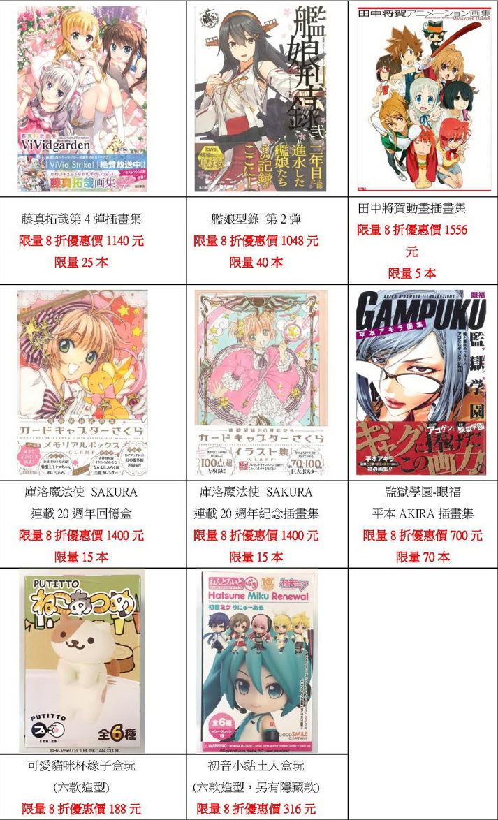 2017動漫節台灣東販推出限量日本進口原裝畫集,計有:Love Live!、齊藤千穗、田中將賀、吉成曜畫集、平本AKIRA─監獄學園《眼福》、藤島康介30週年自選、藤真拓哉第4彈、艦娘型錄 第2彈、庫洛魔法使SAKURA 連載20週年的紀念插畫集及回憶盒,多款限量原裝畫集不僅讓您可以追憶過往您所喜歡的動漫角色更可以搭上目前流行的風潮,同時在眾多畫集簇擁中登場的初音未來小黏土人盒玩以及可愛貓咪杯緣子則成為了其中較突出的存在並期待著您的青睞。