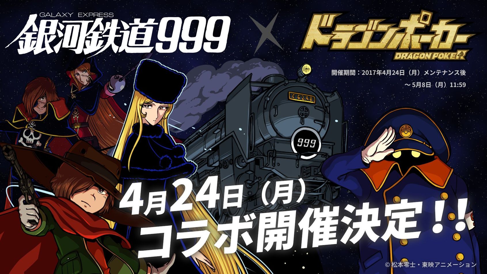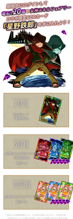 為了慶祝此次的合作活動,登入獎勵也同時進行,只要登入一日,不須抽卡即可獲得銀河鐵道999的男主角星野鐵郎。
