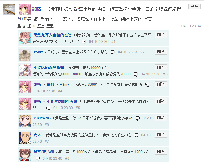 各位看/寫小說的時候一般喜歡多少字數一章的?