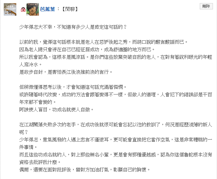 若有會員看見自己的發言出現在某次茶餘飯後討論的收集中,不希望「那次」的發言被拍下。請寄信給我,我會將您的部份剪下。