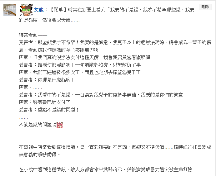 常在新聞上看到「我要的不是錢,我才不希罕那些錢,我要的是態度」然後要求天價