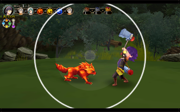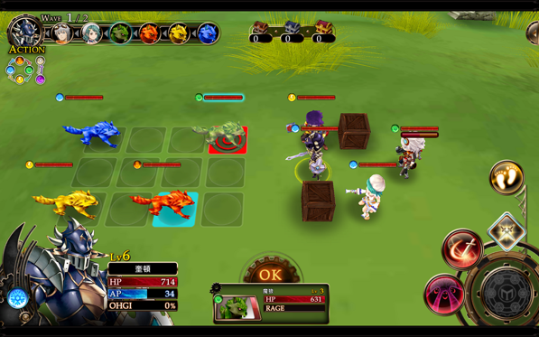 當陣型選擇完畢後進入戰局,角色的位置是可以再進行調動(遊玩中選右手邊有腳印的圖案),每位角色可發動的攻擊也不同(一隻角色共有多種技能可選擇,不同技能可以發動的範圍也有所不同),可根據局勢選擇適當的技能進行攻擊,有些角色的技能附帶擊退,可善加利用在一些高防禦的對手,讓他到後排將高攻擊的角色替換到前排優先攻擊喔!