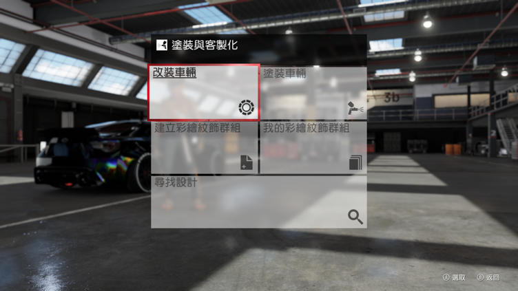 有改裝車輛、塗裝車輛、建立彩繪紋飾群組、我的彩繪紋飾群組以及尋找設計