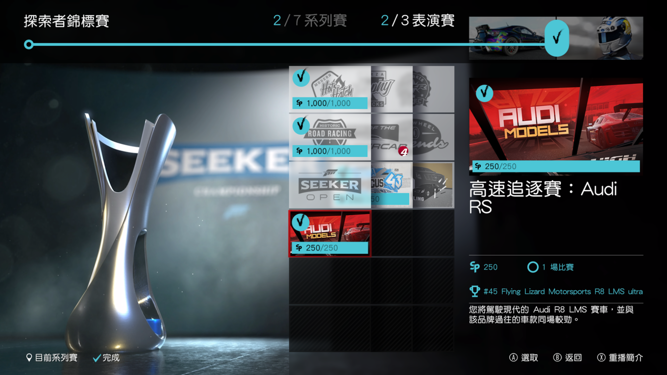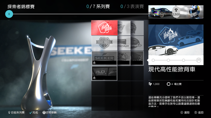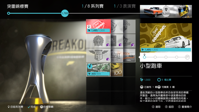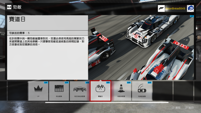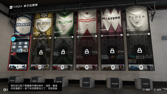 探索者錦標賽、突圍錦標賽、進化版錦標賽、征服錦標賽、名車錦標賽、forza 車手盃
