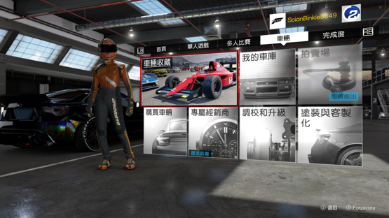 車輛收藏、我的車庫、拍賣場、購買車輛、專屬經銷商、校對和升級以及塗裝與客製化