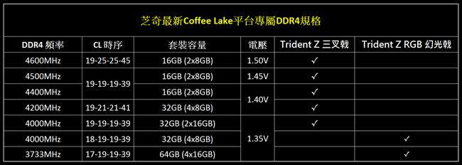 身為Intel 及各大主機板品牌的長期策略夥伴,芝奇已完成多款記憶體與Coffee Lake 處理器及 300系列主機板的相容性測試,詳細規格請參照下表: