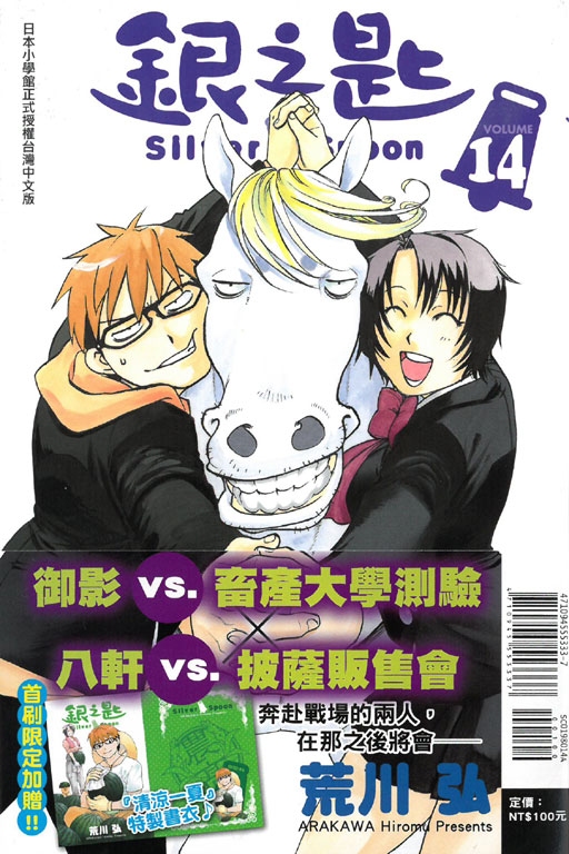由《鋼之鍊金術師》作者「荒川弘」老師,自2011年19號開始連載於小學館旗下少年漫畫雜誌《週刊少年Sunday》的人氣作品《銀之匙 Silver Spoon》,將於10月27日東立發售台版最新第14集《首刷附錄版》,《首刷附錄版》將隨書加贈「清涼一夏」特製書衣。請喜歡的讀者多多支持!!
