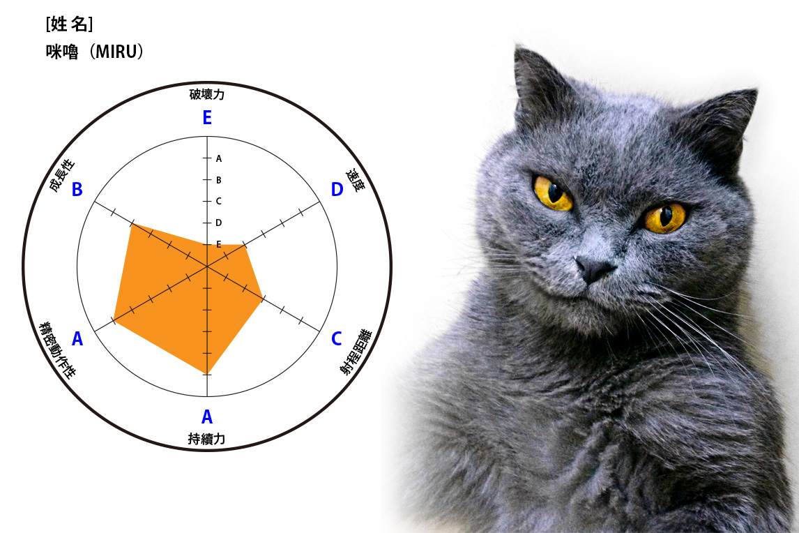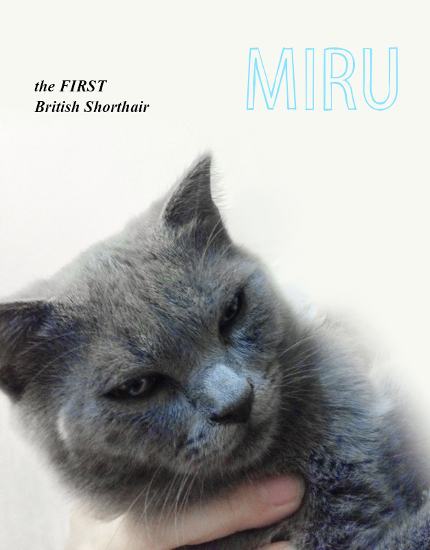 咪嚕(MIRU),性別:公,2013 年 5 月 6 日生,金牛座,有摺耳基因的英國短毛貓,黃眼,灰色毛色,俗稱:藍貓。他來自高雄的一間寵物美容店,由店長飼養的同品種貓隻後代選來,那天南下只是想看看對方提供的藍貓,卻沒想到對方已經在車站把 "東西" 都備妥了,貓和籃子以及牠吃的飼料和貓砂......