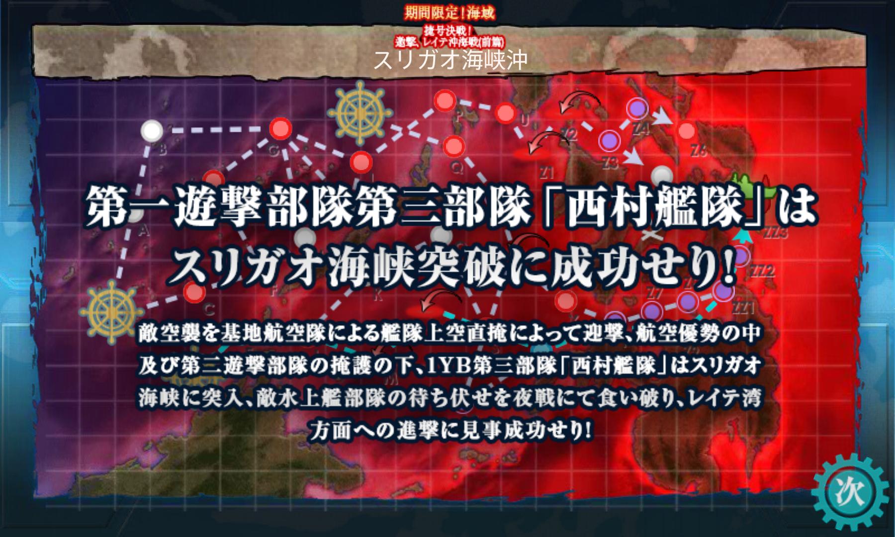 雷伊泰灣西方,蘇里高海峽被圍上層層機雷網。我等之『阿武隈』一馬當先地開進這片機雷海域的話,即使前方幾艘因此損失,後方主力也能保存完好戰力突入灣內。