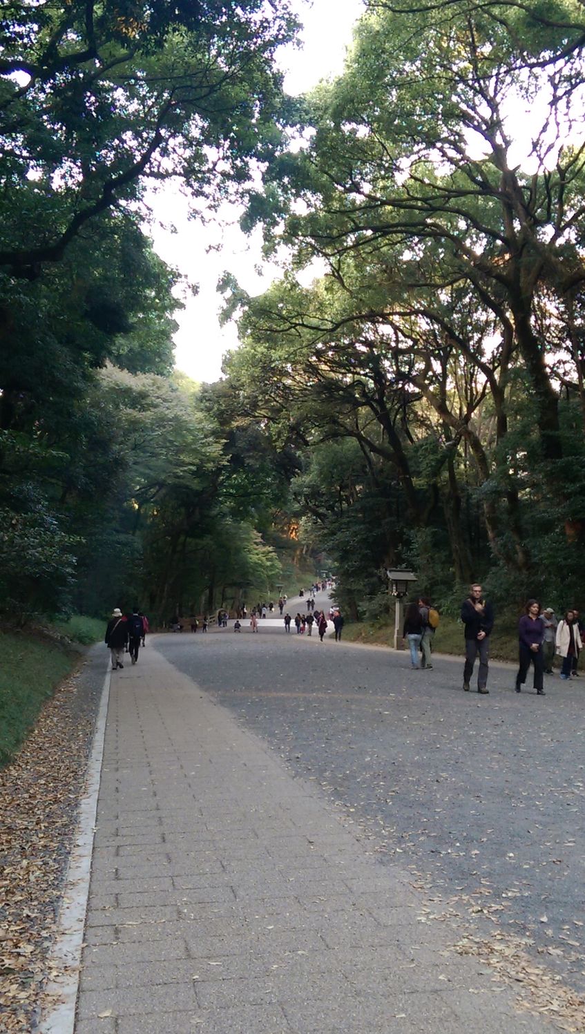 重點!通往本殿的路超遠!兩旁也就是只有古木而已,其餘幾乎沒有什麼東西,頂多就是一些菊花季和展覽的小模型,老實說蠻單調的。話說日本的路真的平,所以我的腳一下便累了,兩旁的走道走累了,我就走到中間採石頭路,稍微紓解一下,雖然我不知道可不可以啦,我看大部分日本還是很規矩地走兩旁的平面道路。