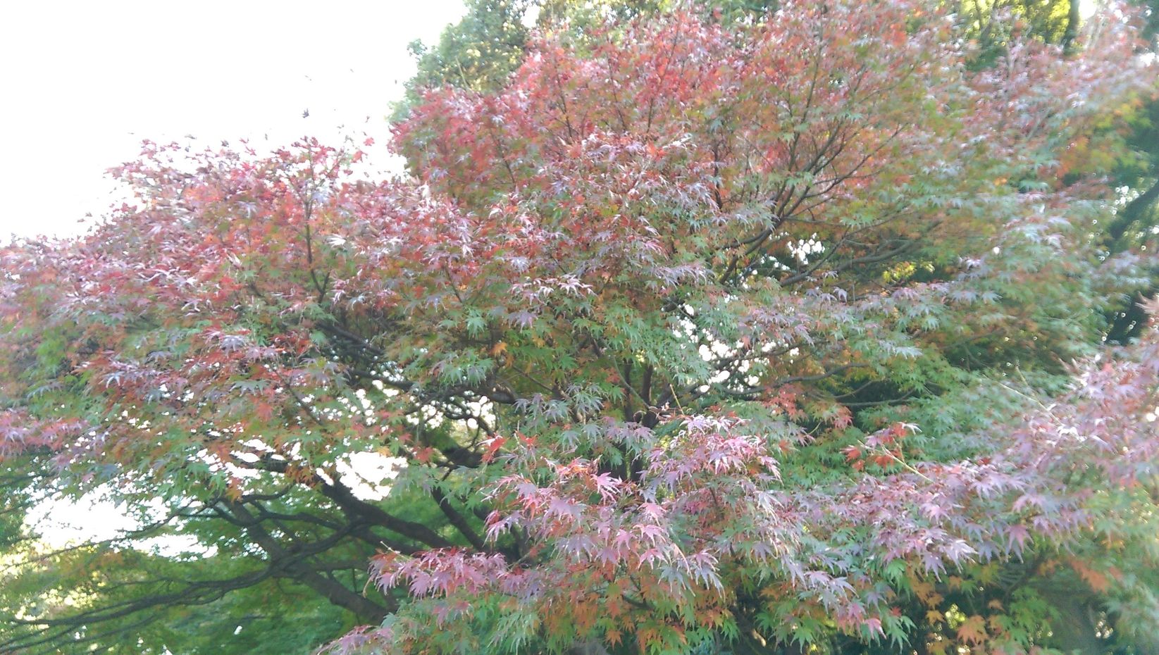 一棵已經轉紅的楓葉,但是莫名地有一層白色鋪在上面,整個庭院只有這棵這樣,超級奇特的。