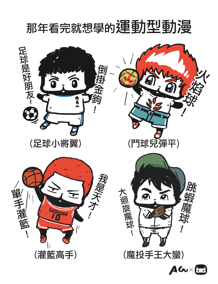 足球小將翼-『撒卡』(足球發音中譯)是好友,所以每個隊員的長相都一個樣。[e18] 鬥球兒彈平-火焰球來襲,用「元氣球」進行掩護。[e22] 灌籃高手-我是天才,單手灌籃!你是屁才,雙腳掛籃![e35] 魔投手王大蠻-跳蝦魔球!?有蝦子嗎!???[e32] 叔叔我小時看過一運漫名為『網球風雲兒』,主角名叫李飛鷹,曾自創一招【八角形】來反擊對手的招式(因網球拍的底部是八角形狀,故取名【八角形】,也就是用球柄底部來回擊的意思)。[e23]