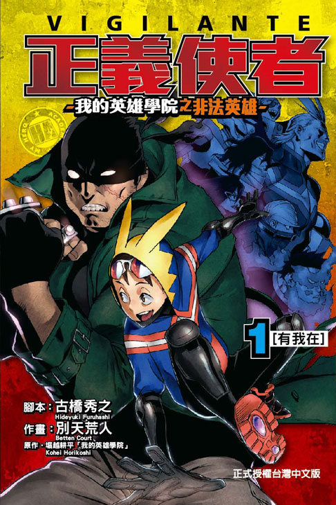 由「別天荒人」老師 (著)、「古橋 秀之」老師 (原著)、「堀越耕平」老師(原作),目前於日本「集英社」旗下少年漫畫電子雜誌《少年Jump+》連載的《我的英雄學院》外傳作品《正義使者-我的英雄學院之非法英雄-》,台灣方面於2018年4月18日「東立」發售台版單行本第1集,定價100元。