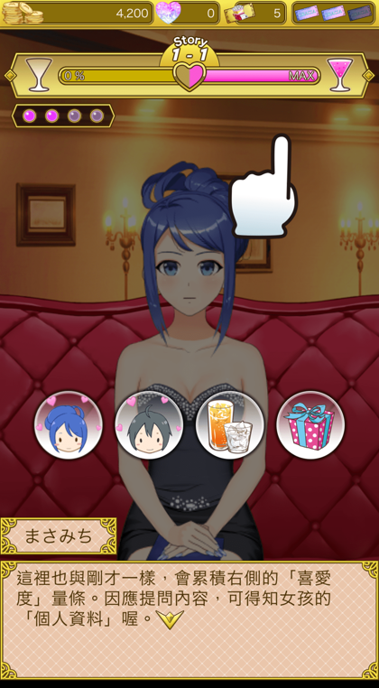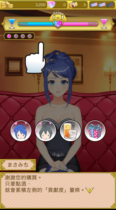 在初始階段貢獻度很容易上升,所以即使花很少錢也能一定程度進行故事。此外,也能贈送同時提升好感度與貢獻度的特別禮物給陪酒女。