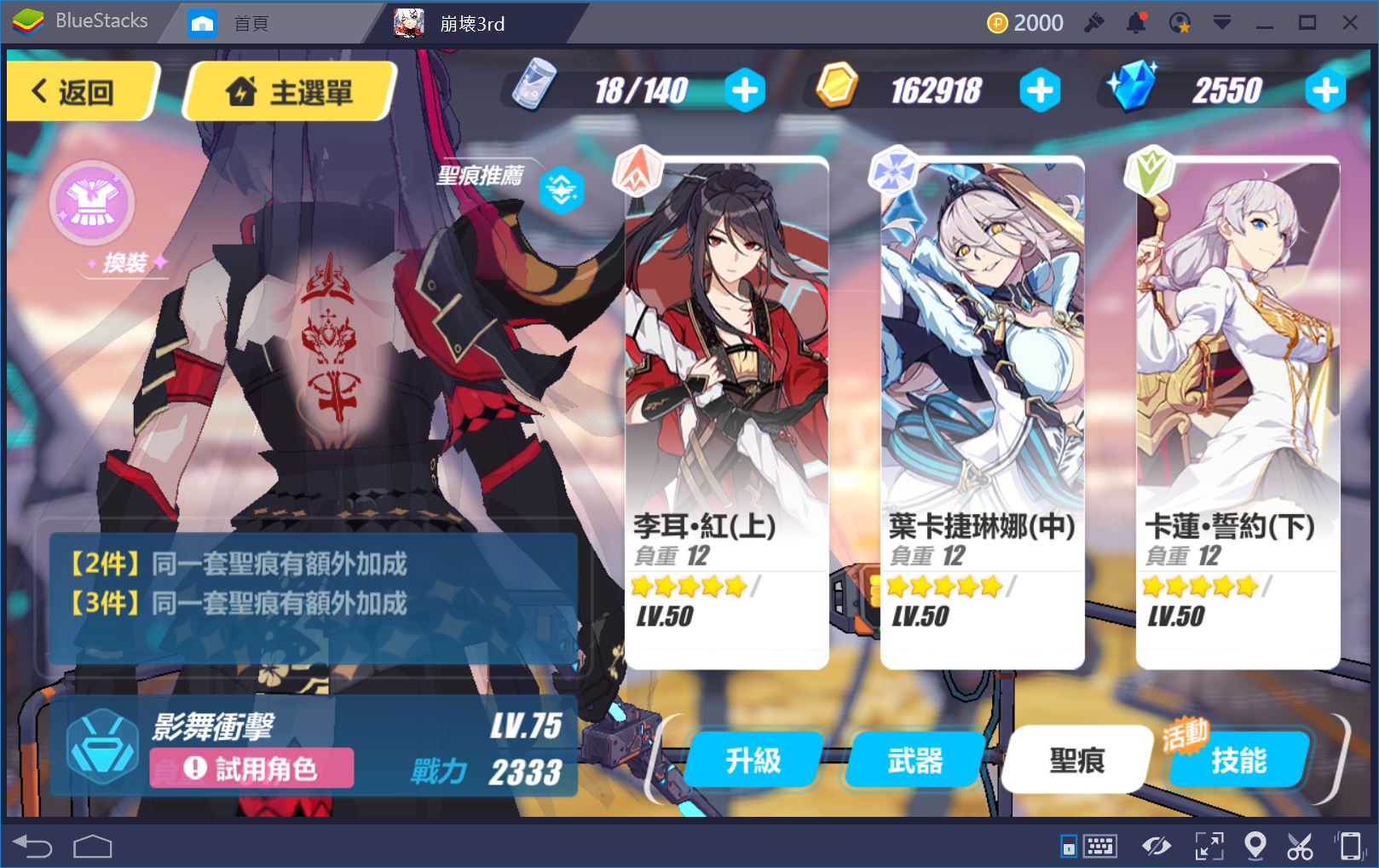 聖痕選擇增加全傷害,物理傷害,爆擊為主,無特別專用聖痕,附上試用角色建議聖痕