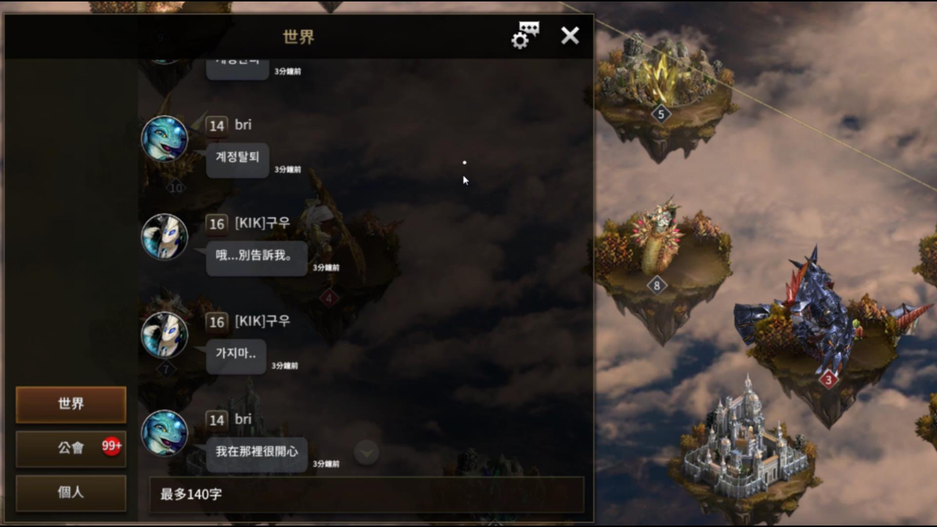 這遊戲韓國玩家頗多,看不懂沒差,點對方的對話就可以翻譯,我待的工會也有印度玩家,也不至於太無聊,但發言建議慎言(茶.......。