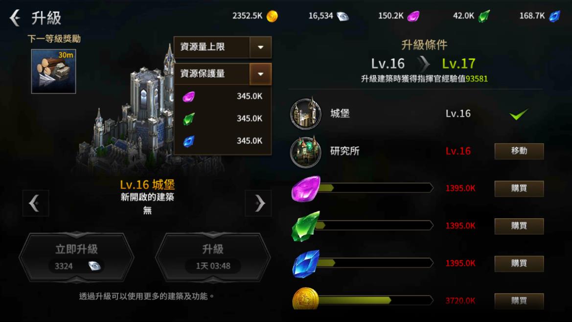 但近期發現很詭異的狀態,明明就在資源保護量的範圍內還是被打的不要不要的,所以資源的累積建議打野外怪來囤積箱子,至於內部生產的想辦法花掉吧(建議用升級建築或寶石轉換來消耗),打怪也能順便累積點數換抽捲。(上限三萬超過不累積)