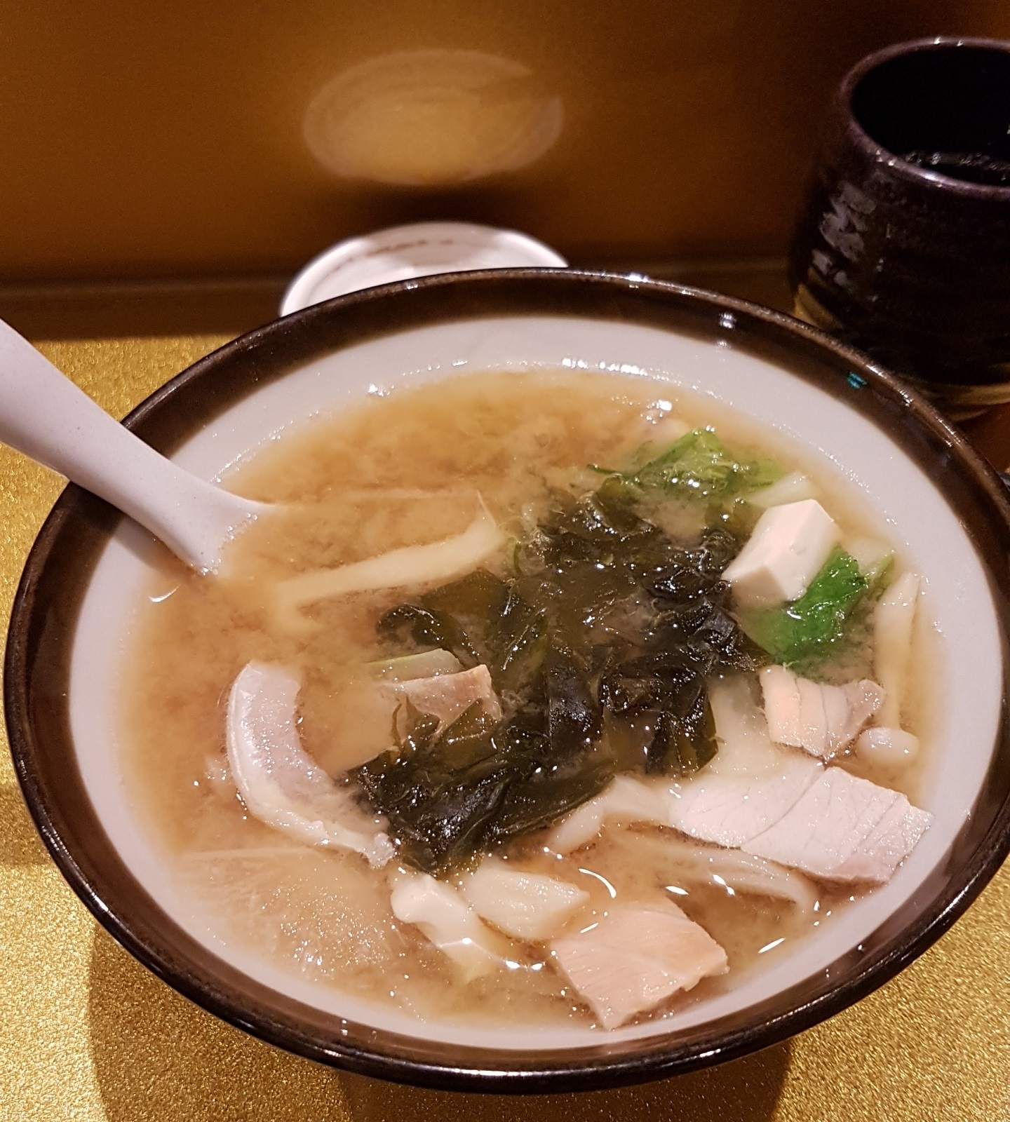 換掉了定食內附的味增湯,另外點了一份魚肉味增,結果因為吃完烏龍麵後就覺得有點飽了,這超大碗喝下去最後飽足感真的爆表了,大多日本料理店都會把魚比較靠骨頭的邊肉拿來加味增,基本上都是提味而已,但這碗裡面有魚肉也有魚片滿滿的料,少說十幾塊魚肉跑不掉。