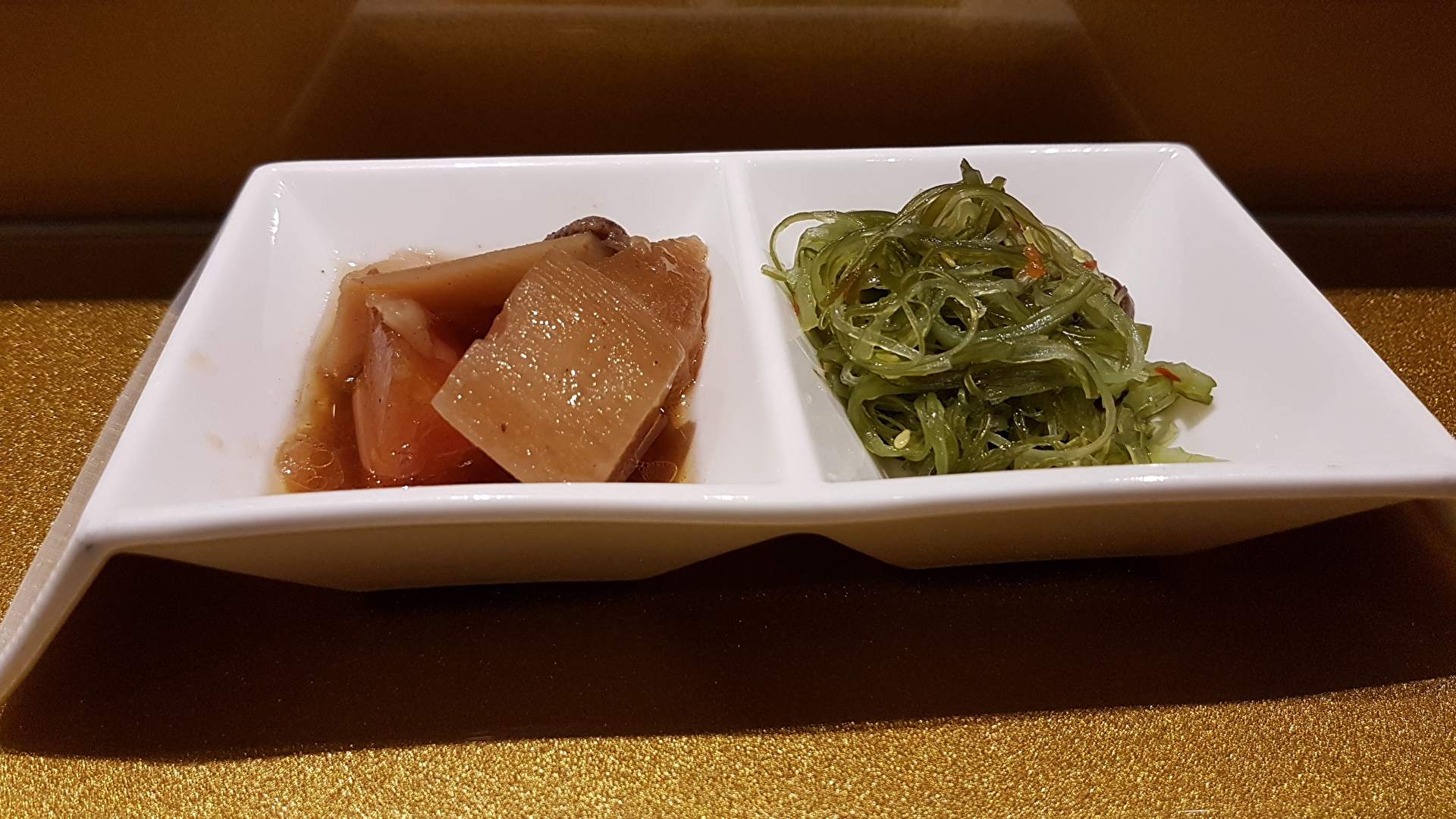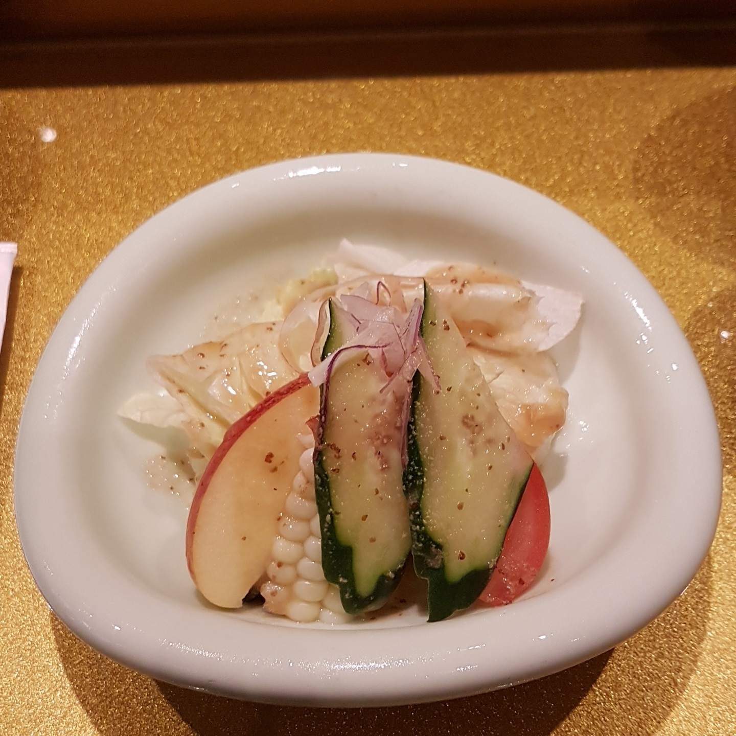 先上來的是沙拉,比起一般外面的沙拉,能明顯感受到食材等級的不同,光蘋果雖然薄薄一片但還能感受到脆度和滿滿的酸甜味,使用的和風醬酸鹹度剛好,不會蓋過食材的味道,原本不太吃黃瓜的我,也是第一次覺得黃瓜好吃的。
