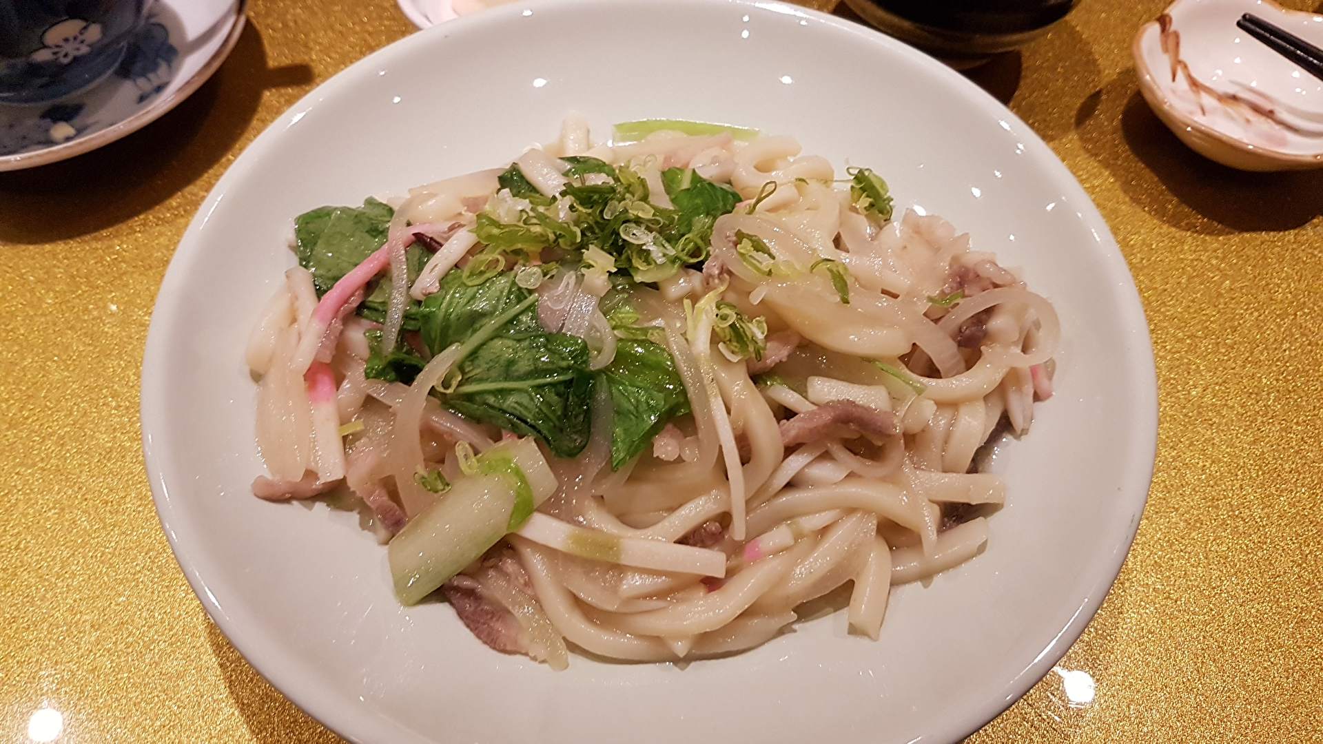 主菜炒烏龍麵和小菜一起上來,烏龍麵帶點勾芡上來,吃起來多了點滑順感,原本以為量可能會吃不飽的,不過其實量還蠻多的,我一個男生都能有飽足感了,小菜剛好能平衡一下烏龍麵的味道,如果還希望味道多點變化店家也提供七味粉可以加。
