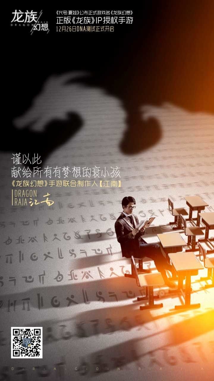 在一分多鐘的宣傳片中,《龍族》作者江南親自參演並講述了那些關於衰小孩和青春的記憶,他表示“我們試著構建另一個載體,來承載《龍族》的世界,和我們共同的青春回憶”,那就是全新次世代RPG手遊《龍族幻想》(曾用名:《代號:夏娃》)。作為中國知名作家,江南確認出任遊戲聯合制作人,共同參與到遊戲的制作當中,在除了小說之外的全新領域內,去再造一個粉絲幻想中的龍族世界。