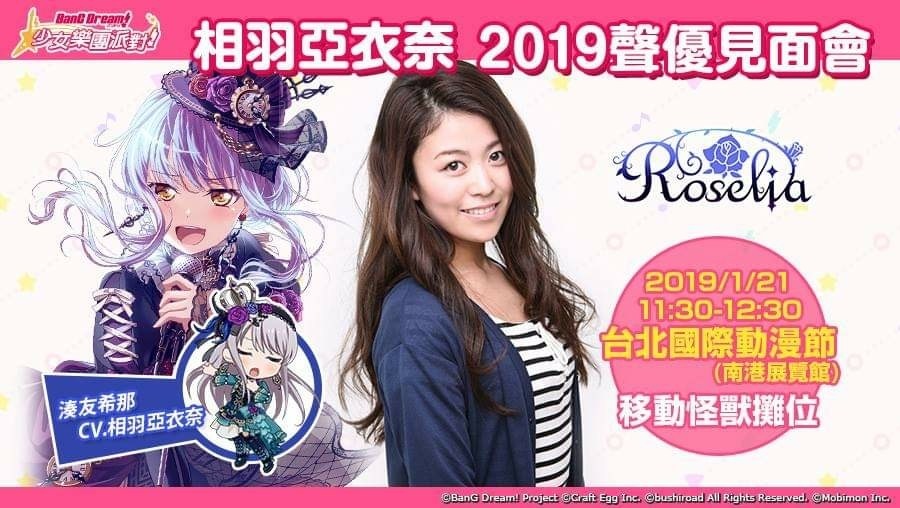 由移動怪獸代理,日本娛樂公司「武士道(Bushiroad)」和 Craft Egg 開發製作的手機音樂節奏遊戲《BanG Dream!少女樂團派對》公開「相羽亞衣奈 2019聲優見面會」參加資格及相關辦法,人氣少女樂團-技巧本格派少女樂團「Roselia」其中一位團員的聲優 相羽亞衣奈 (飾演主唱「湊友希那」),將來到台灣舉辦粉絲見面會。