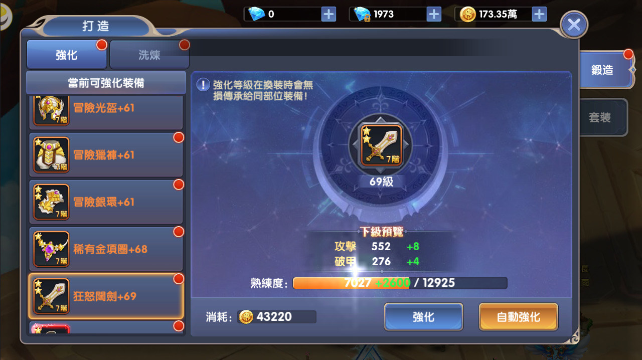 而在裝備的強化上,是這遊戲中最主要的金幣消耗來源,每次強化都是提升部分熟練度,熟練度到達上限時才會增加等級,再加上每件裝備都可以強化,基本上95%的金幣都會投在這個地方,在這邊教大家一個重點,裝備強化後提升的能力值是線性的,但花費的金幣卻是非線性的,也就是說平均的強化裝備會比單一強化來的划算,可以嘗試看看。另外再替換高等裝備的時候,相同部位的強化等級也會傳承下去,所以不需要考慮到浪費金幣的問題。