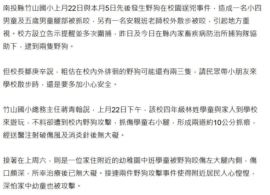 南投縣竹山國小上月22日與本月5日先後發生野狗在校園逞兇事件,造成一名小四男童及五歲男童腿部被抓咬,另有一名安親班老師校外散步被咬,引起地方重視。校方設立告示提醒並多次圍捕,昨日及今日在縣內家畜疾病防治所捕狗隊協助下,逮到兩隻野狗。