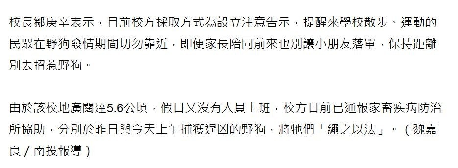 校長鄒庚辛表示,目前校方採取方式為設立注意告示,提醒來學校散步、運動的民眾在野狗發情期間切勿靠近,即便家長陪同前來也別讓小朋友落單,保持距離別去招惹野狗。