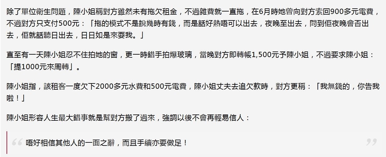 除了單位衛生問題,陳小姐稱對方雖然未有拖欠租金,不過雜費就一直拖,在6月時她曾向對方索回900多元電費,不過對方只支付500元:「拖的模式不是說幾時有錢,而是話好熱唔可以出去,夜晚至出去,問到佢夜晚會否出去,佢就話聽日出去,日日如是來耍我。」