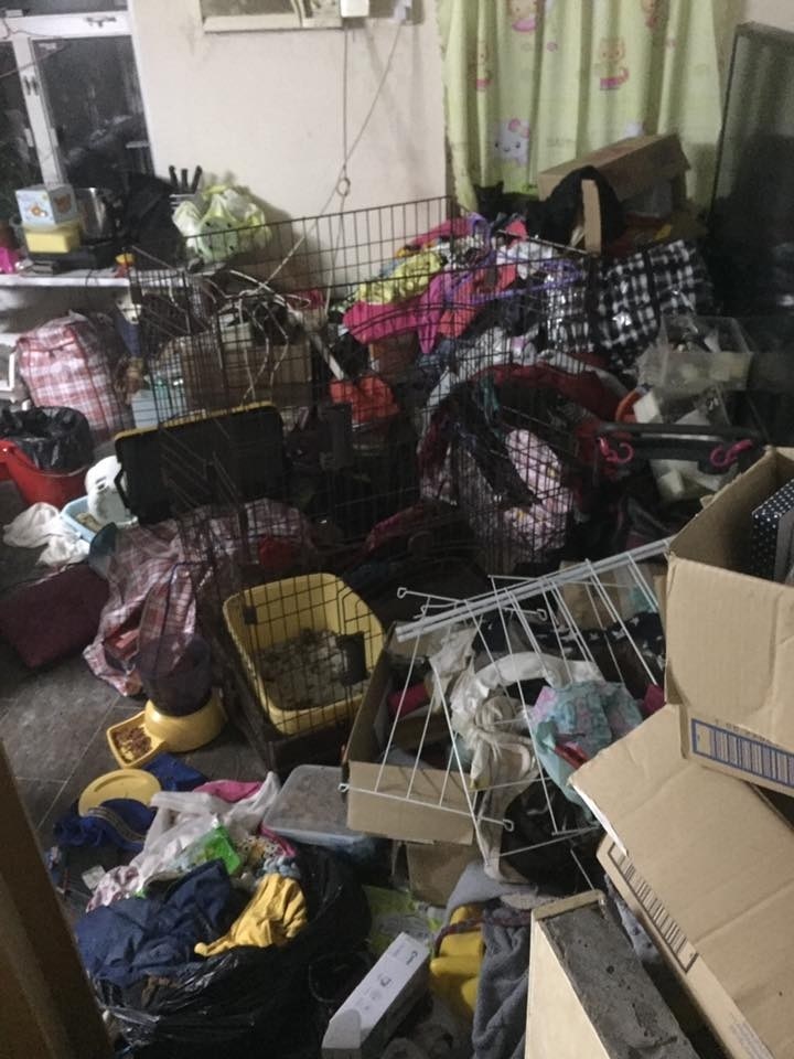 當時一開門已經有『過億』曱甴從門縫湧出來,老公一抽起雪櫃時,亦有一堆曱甴爬出來;屋中地下堆積了最少3吋厚的垃圾,要用腳掃開才看得見地板,屋中有不少垃圾、曱甴屍體、濕到發霉的布,當中混雜了貓的排泄物。