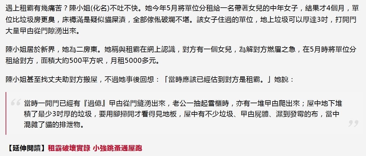遇上租霸有幾痛苦?陳小姐(化名)不吐不快。她今年5月將單位分租給一名帶著女兒的中年女子,結果才4個月,單位比垃圾房更臭,床褥滿是疑似貓屎漬,全部傢俬破爛不堪。該女子住過的單位,地上垃圾可以厚達3吋,打開門大量曱甴從門隙湧出來。
