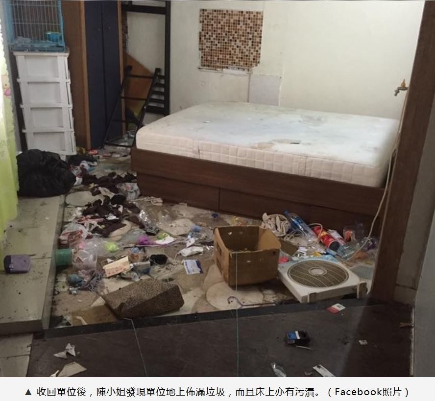 該租霸5月入住陳小姐分租單位,由於陳小姐本身住毗鄰,她在6、7月已發現單位衛生問題嚴重,故通知對方要收拾好,否則要搬走,對方一度收拾過,但至9月下旬,單位閘門壞了、不能關上,她發現對方故態復萌,單位凌亂又污糟,狀甚恐怖,她即晚她要求對方於10月31日前搬走: