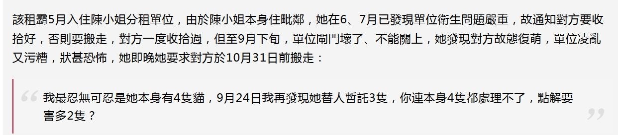 小姐稱在她多次要求下,並在網上揭發事件,對方終於在她發出正式通知後漏夜遷出單位。陳小姐說她其實還未敢入屋仔細檢查,因為單位奇臭無比,有混集寵物排泄物、垃圾、吸煙的臭味,她收回單位連續開窗2天,臭味都揮之不去。
