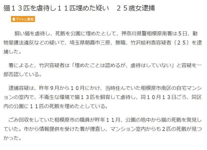 逮捕容疑は、昨年9月から10月にかけ、当時住んでいた相模原市南区の自宅マンションの室内で、不衛生な環境で猫13匹を飼育して虐待し、同10月13日ごろ、同区内の公園に11匹の死骸を埋めたとしている。