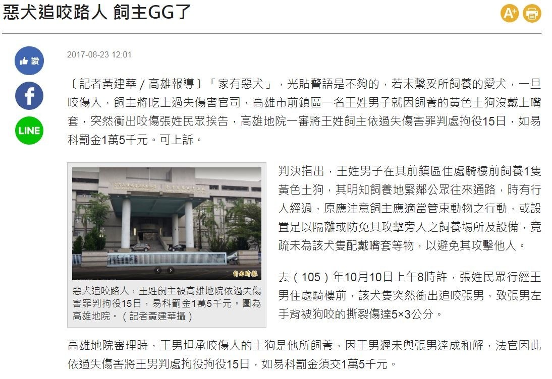 高雄地院審理時,王男坦承咬傷人的土狗是他所飼養,因王男遲未與張男達成和解,法官因此依過失傷害將王男判處拘役拘役15日,如易科罰金須交1萬5千元。