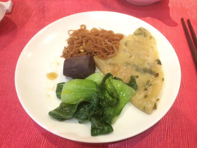 隔天早餐也是吃這間,畢竟我爸喜歡嘛。早餐採自助式,然後服務生會送上燒賣、叉燒包之類一、兩樣小點。燒賣很弱,跟便宜的冷凍燒賣差不多。優點是有青菜。
