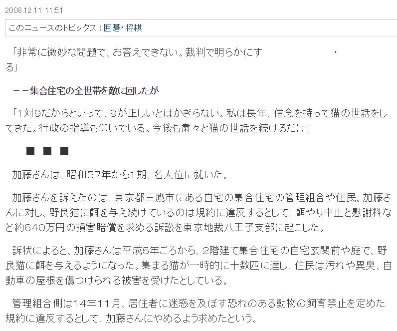 自宅に住む野良猫への餌やりが原因で、集合住宅10世帯のうち自宅をのぞく9世帯すべてから、餌やり中止と約640万円の損害賠償を求められた将棋の加藤一二三・九段(68)。対局の立会人を務めた際、縁側に侵入した猫に「ハロー! 将棋に興味があるかい?」と語りかけたほどの猫好きで知られる元名人を直撃した。