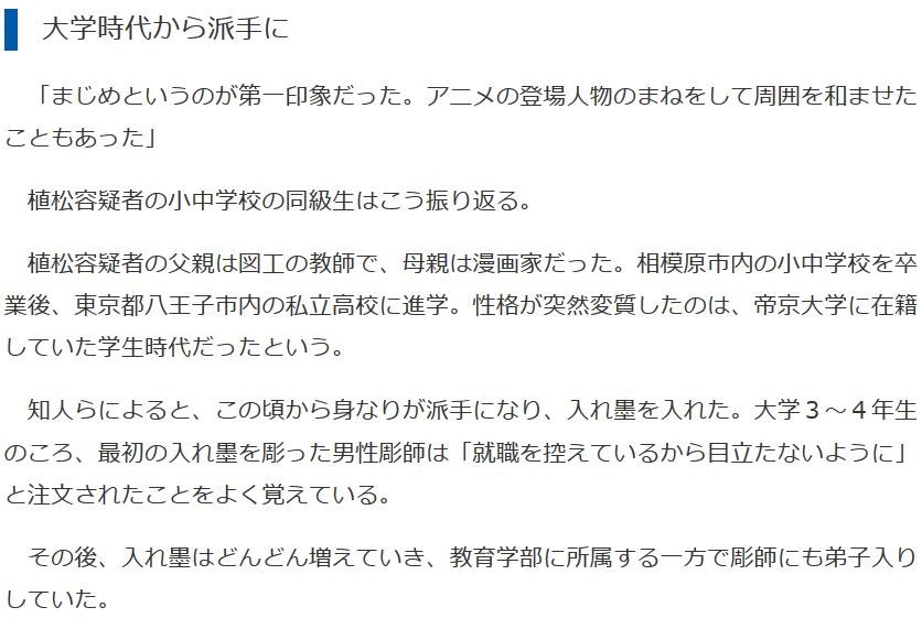 植松容疑者の父親は図工の教師で、母親は漫画家だった。相模原市内の小中学校を卒業後、東京都八王子市内の私立高校に進学。性格が突然変質したのは、帝京大学に在籍していた学生時代だったという。